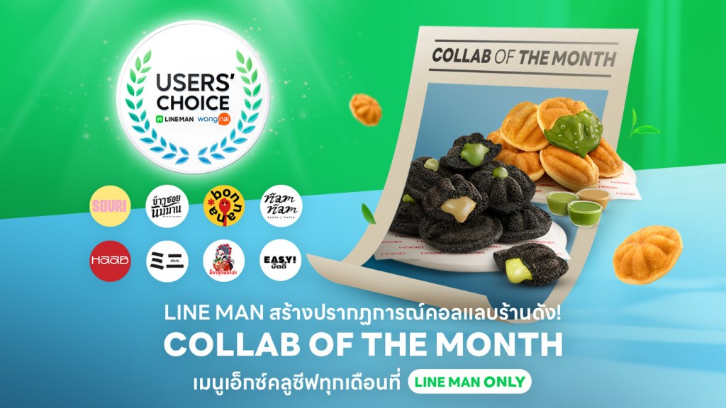 แคมเปญ COLLAB OF THE MONTH ไม่เพียงสร้างสีสันให้สายกินได้ลิ้มลองเมนูใหม่ทุกเดือน แต่ยังตอกย้ำพลังของรางวัล LINE MAN Wongnai Users’ Choice ที่ช่วยผลักดันร้านอาหารไทยให้เป็นที่รู้จักในวงกว้าง และขับเคลื่อนวงการอาหารไทยให้คึกคักยิ่งขึ้น สามารถติดตามเมนูเอ็กซ์คลูซีฟได้ทุกเดือนผ่านทาง https://www.facebook.com/linemanth/?locale=th_TH และสั่งได้เฉพาะบน LINE MAN ONLY