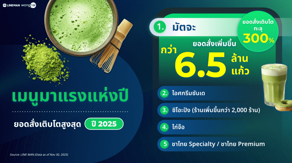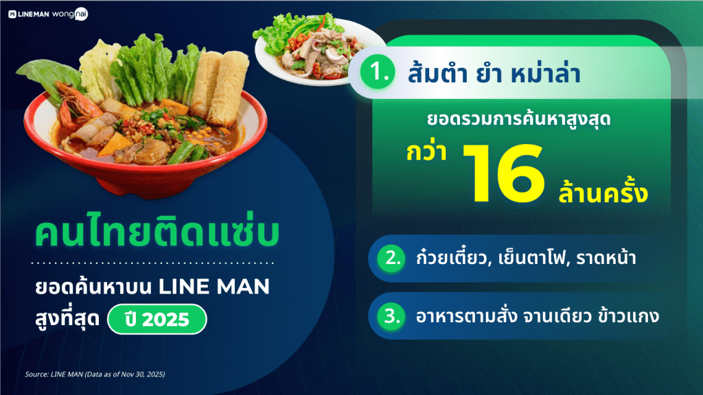 LINE MAN แพลตฟอร์มฟู้ดเดลิเวอรีอันดับ 1 ของไทย สรุปเทรนด์การกินของคนไทยปี 2025 จากฐานข้อมูลผู้ใช้งานกว่า 10 ล้านคน และร้านอาหารกว่า 7 แสนร้านทั่วประเทศ พบความแซ่บยังคงอยู่ในดีเอ็นเอของคนไทย ดันเมนู “ตำปูปลาร้า” ครองแชมป์ยอดสั่งสูงสุดกว่า 8 ล้านจานทั่วประเทศ ด้านเมนู “มัตจะ” เครื่องดื่มมาแรงแซงทุกเทรนด์ยอดสั่งพุ่งกว่า 6.5 ล้านแก้ว เติบโตทะลุ 300% เมื่อเทียบกับปีก่อนหน้า กลายเป็นเครื่องดื่มที่เติบโตเร็วที่สุดบนแพลตฟอร์ม