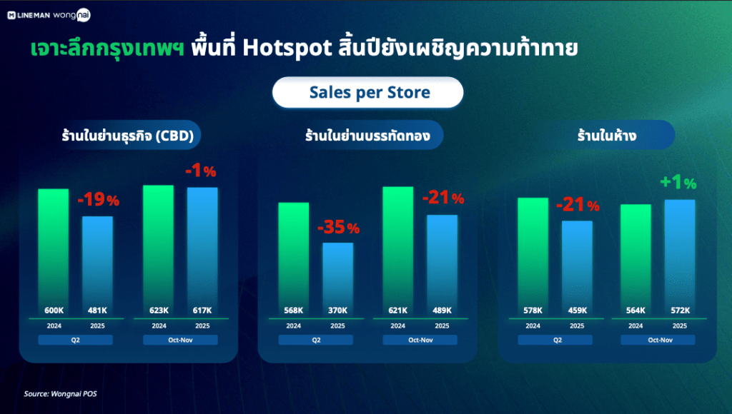 - Central business district (Sukhumvit–Silom–Sathorn): sales per store at -19% in Q2, improving but still slightly negative at -1% in Oct–Nov YoY